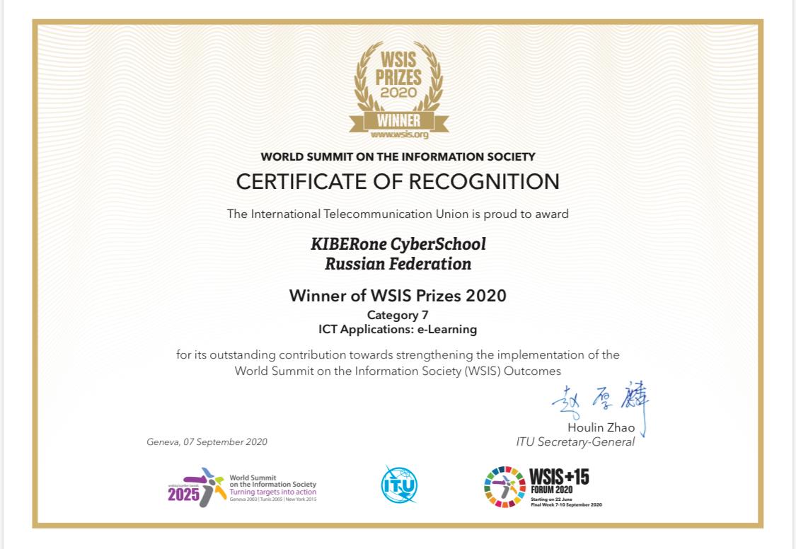 Признан лучшим проектом международного уровня в сфере цифрового образования по версии Генеральной Ассамблеи ЮНЕСКО. Победитель в it-конкурсе WSIS Prizes 2020 в категории цифрового обучения